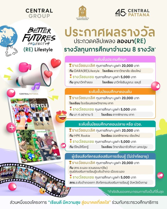ณ ศูนย์การค้าเซ็นทรัล เชียงใหม่ ร่วมกับ กระทรวงศึกษาธิการ บริษัท เซ็นทรัลพัฒนา จำกัด (มหาชน) และ กลุ่มบริษัทเซ็นทรัล จัดพิธีมอบประกาศนียบัตรและทุนการศึกษาให้แก่ผู้ชนะการประกวดคลิปวิดีโอในโครงการ “ลองมา (RE)” ซึ่งเป็นส่วนหนึ่งของความร่วมมือภายใต้บันทึกข้อตกลง (MOU) การส่งเสริมศักยภาพนักเรียน นักศึกษา ตามนโยบาย “เรียนดี มีความสุข สู่อนาคตที่สดใส”