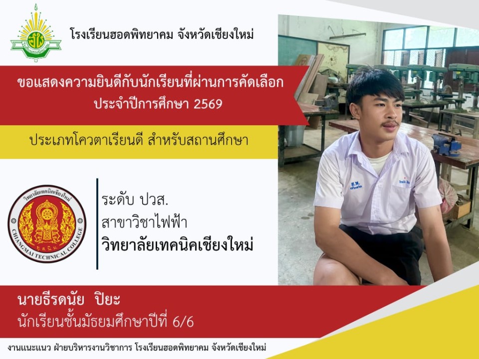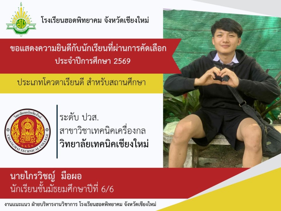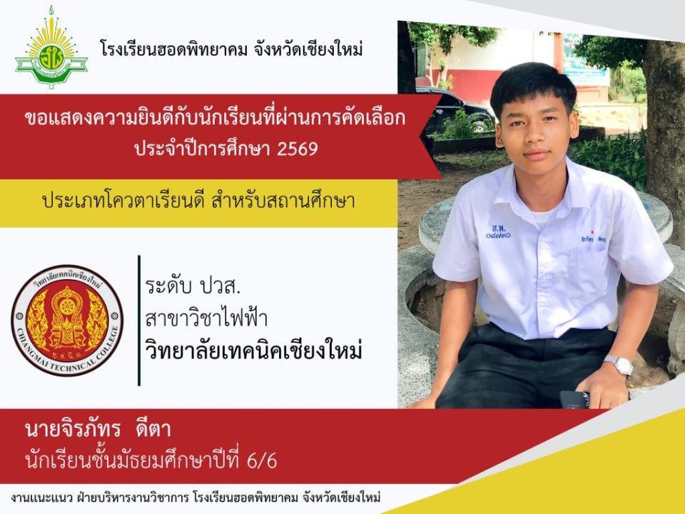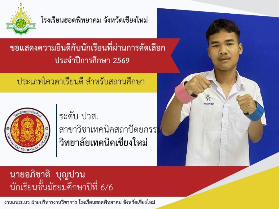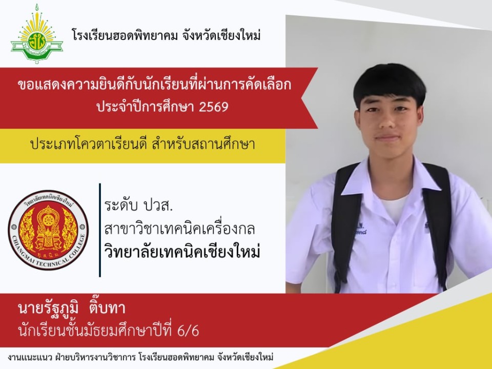 โรงเรียนฮอดพิทยาคม ขอแสดงความยินดีกับนักเรียนชั้นมัธยมศึกษาปีที่ 6 ปีการศึกษา 2568 ที่ได้รับการคัดเลือกเข้าศึกษาต่อในระดับอุดมศึกษา