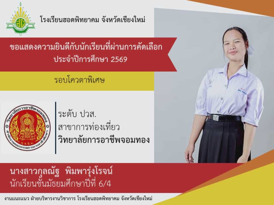 โรงเรียนฮอดพิทยาคม ขอแสดงความยินดีกับนักเรียนชั้นมัธยมศึกษาปีที่ 6 ปีการศึกษา 2568 ที่ได้รับการคัดเลือกเข้าศึกษาต่อในระดับอุดมศึกษา