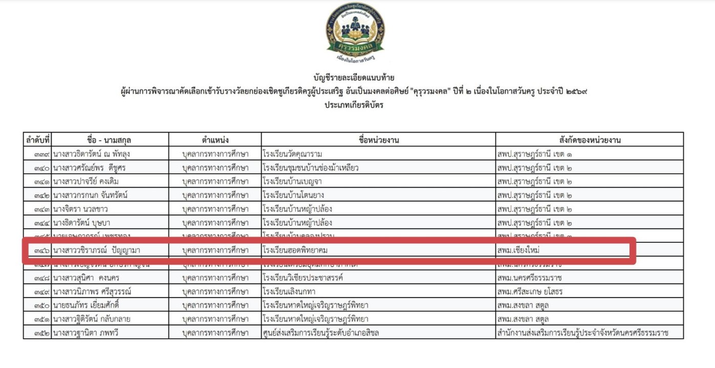 เนื่องในโอกาสได้รับรางวัลยกย่องเชิดชูเกียรติครูผู้ประเสริฐ อันเป็นมงคลต่อศิษย์ "คุรุวรมงคล" ปีที่ 2 เนื่องในโอกาสวันครู ประจำปี 2569 ประเภทเกียรติบัตร
